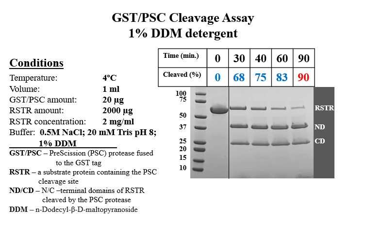 Additional processing information: After a CL7-tagged protein binds the activated Im7 resin, PSC is applied to the column to release the protein from the CL7 tag. The final protease concentration in the eluted sample comprises ~1.5-3% of total impurities. If needed, PSC can be purified from the sample with a GST-trap column or size exclusion chromatography.
